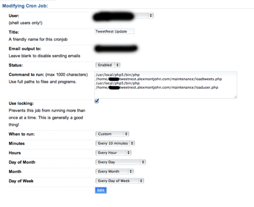 At the bottom of the screen that runs the script you’ll find some code that looks like this: php /home/USERNAME/TWEETNESTURL/maintenance/loadtweets.php