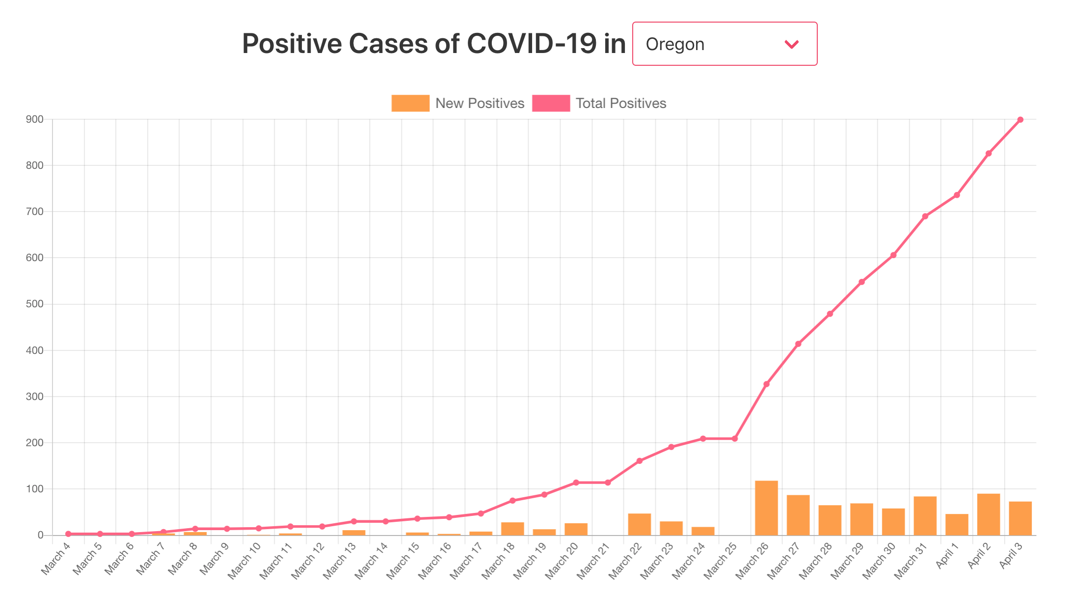 In the interest of that goal, I build a little web application to track new and total Covid-19 cases in individual states. It pulls in current data from The Covid Tracking Project and displays it using line and bar graphs. As health authorities around the country update their data, the charts update, too.